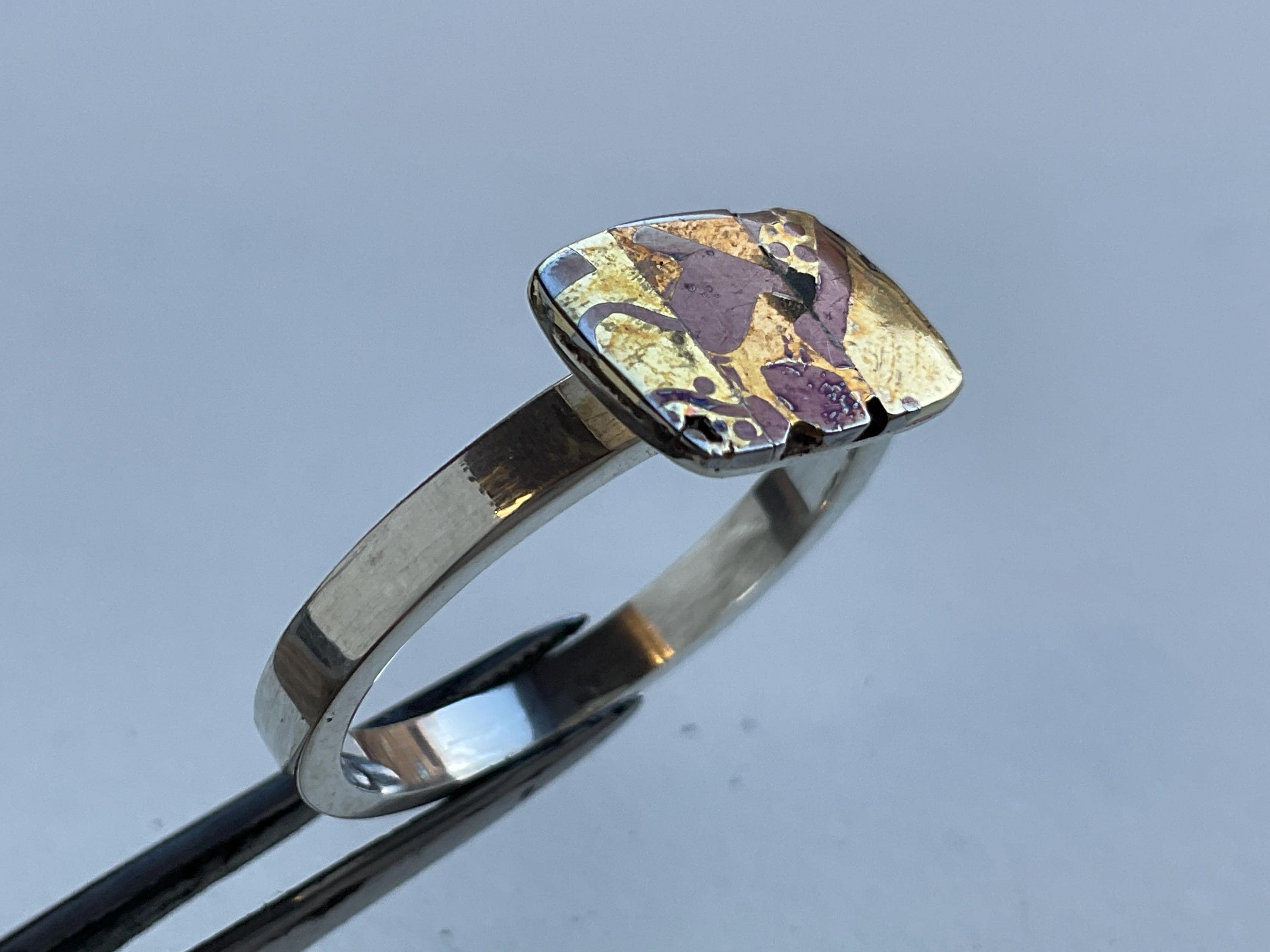 This work is made from recycled metal plus sterling silver for the parts which contact the wearer’s skin. I add a layer of clear wax to the surface of the recycled parts to slow the rate of tarnishing. You should wipe off fingerprints as soon as you see them with a soft cloth. Avoid acids, abrasives or salt, they will remove the coloured layer and react with the metal. The work will age gracefully.