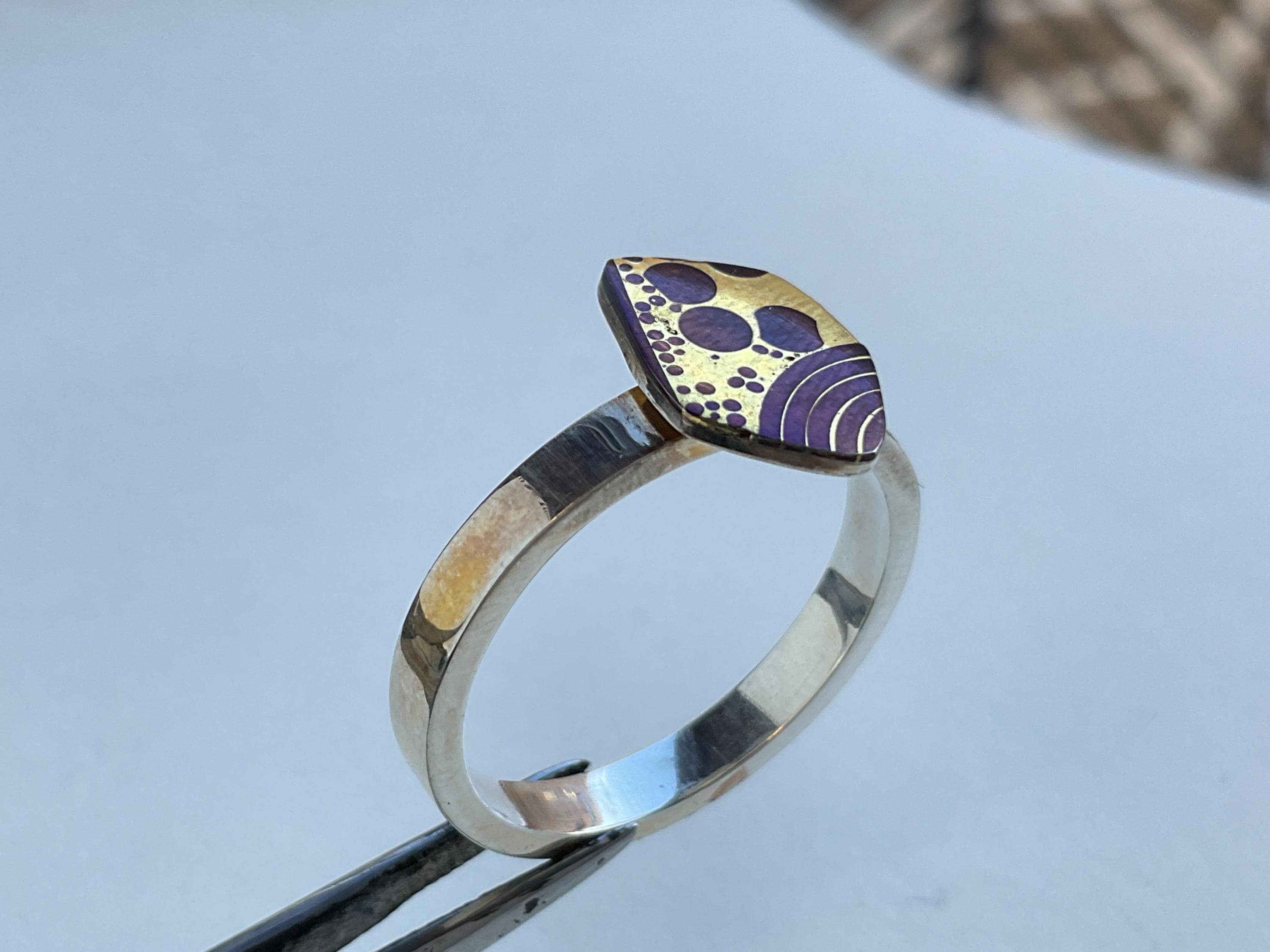 This work is made from recycled metal plus sterling silver for the parts which contact the wearer’s skin. I add a layer of clear wax to the surface of the recycled parts to slow the rate of tarnishing. You should wipe off fingerprints as soon as you see them with a soft cloth. Avoid acids, abrasives or salt, they will remove the coloured layer and react with the metal. The work will age gracefully.
