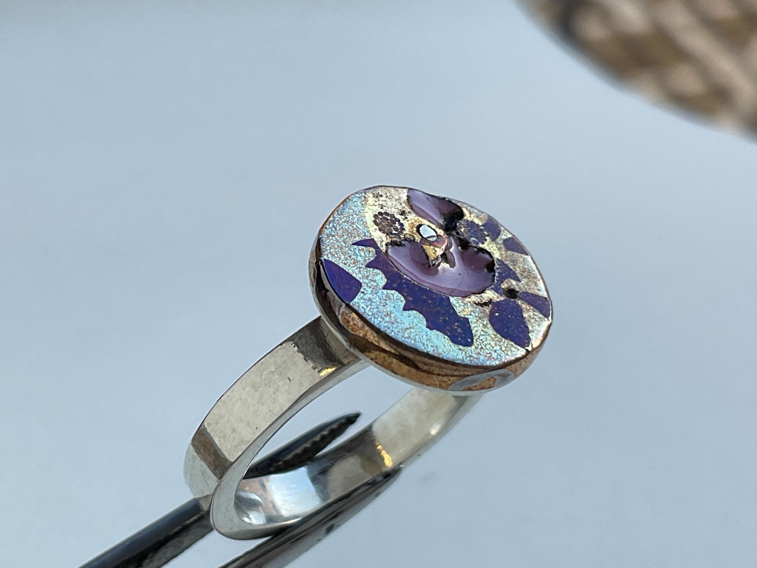 This work is made from recycled metal plus sterling silver for the parts which contact the wearer’s skin. I add a layer of clear wax to the surface of the recycled parts to slow the rate of tarnishing. You should wipe off fingerprints as soon as you see them with a soft cloth. Avoid acids, abrasives or salt, they will remove the coloured layer and react with the metal. The work will age gracefully.