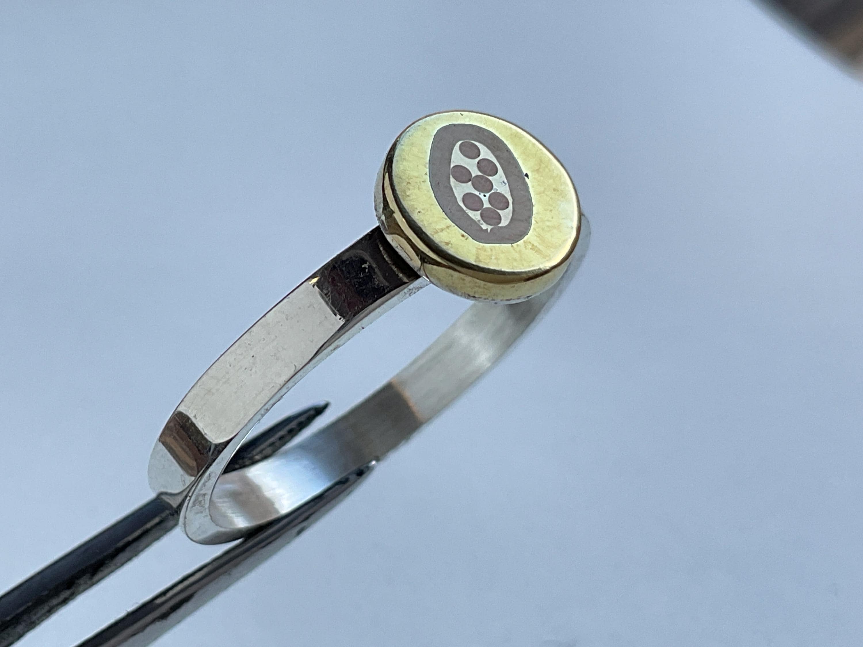 This work is made from recycled metal plus sterling silver for the parts which contact the wearer’s skin. I add a layer of clear wax to the surface of the recycled parts to slow the rate of tarnishing. You should wipe off fingerprints as soon as you see them with a soft cloth. Avoid acids, abrasives or salt, they will remove the coloured layer and react with the metal. The work will age gracefully.
