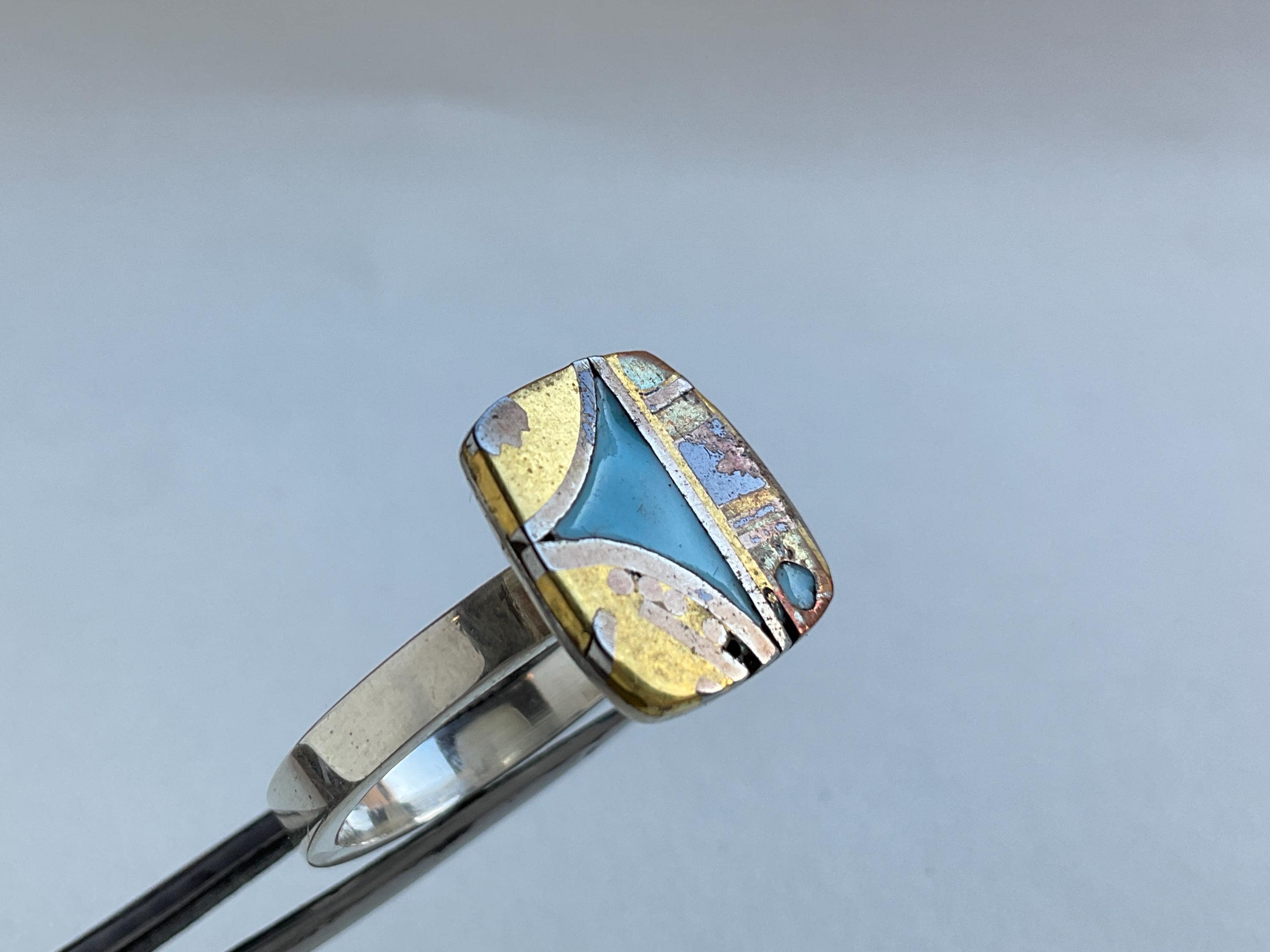 This work is made from recycled metal plus sterling silver for the parts which contact the wearer’s skin. I add a layer of clear wax to the surface of the recycled parts to slow the rate of tarnishing. You should wipe off fingerprints as soon as you see them with a soft cloth. Avoid acids, abrasives or salt, they will remove the coloured layer and react with the metal. The work will age gracefully.