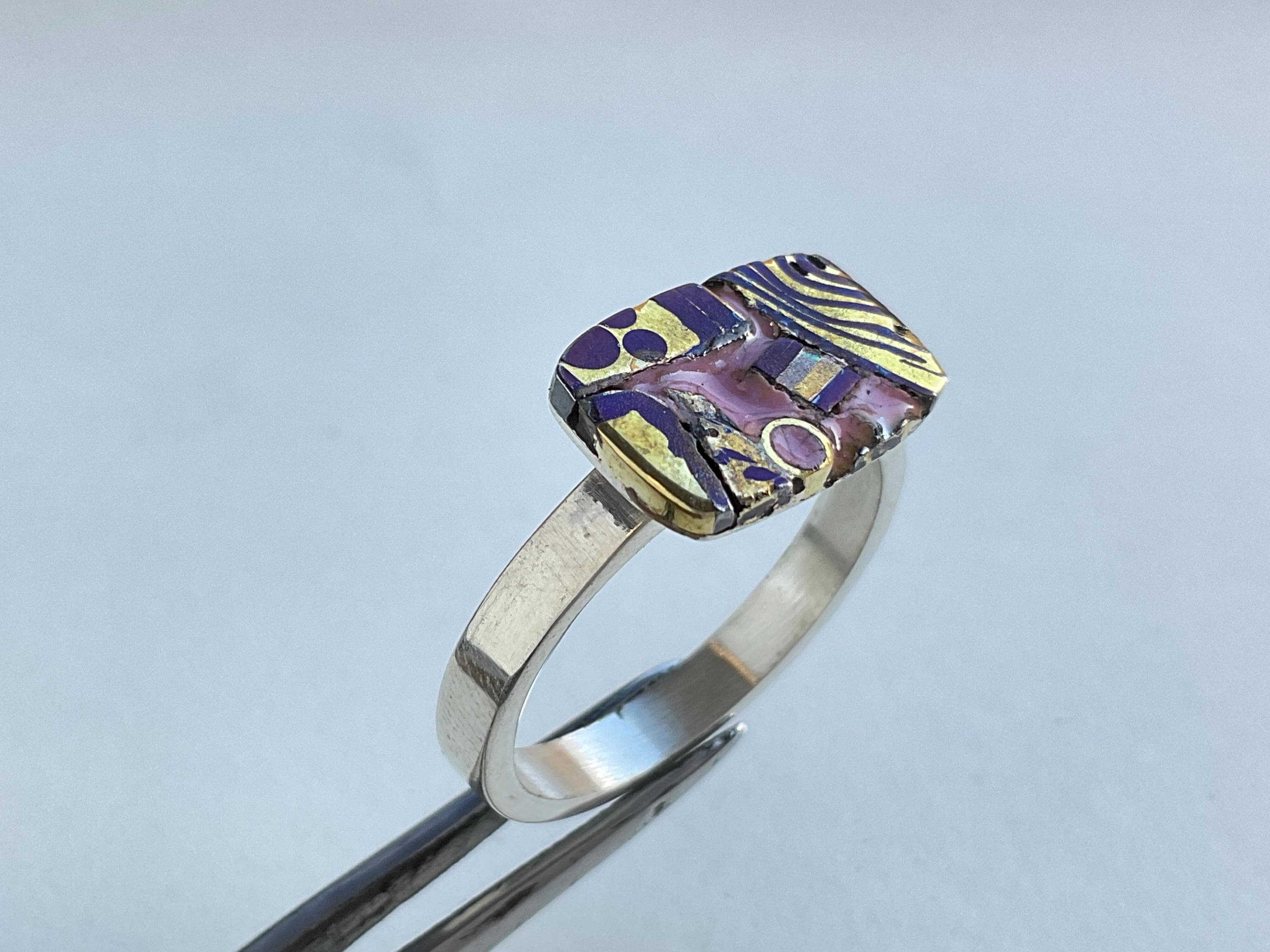 This work is made from recycled metal plus sterling silver for the parts which contact the wearer’s skin. I add a layer of clear wax to the surface of the recycled parts to slow the rate of tarnishing. You should wipe off fingerprints as soon as you see them with a soft cloth. Avoid acids, abrasives or salt, they will remove the coloured layer and react with the metal. The work will age gracefully.