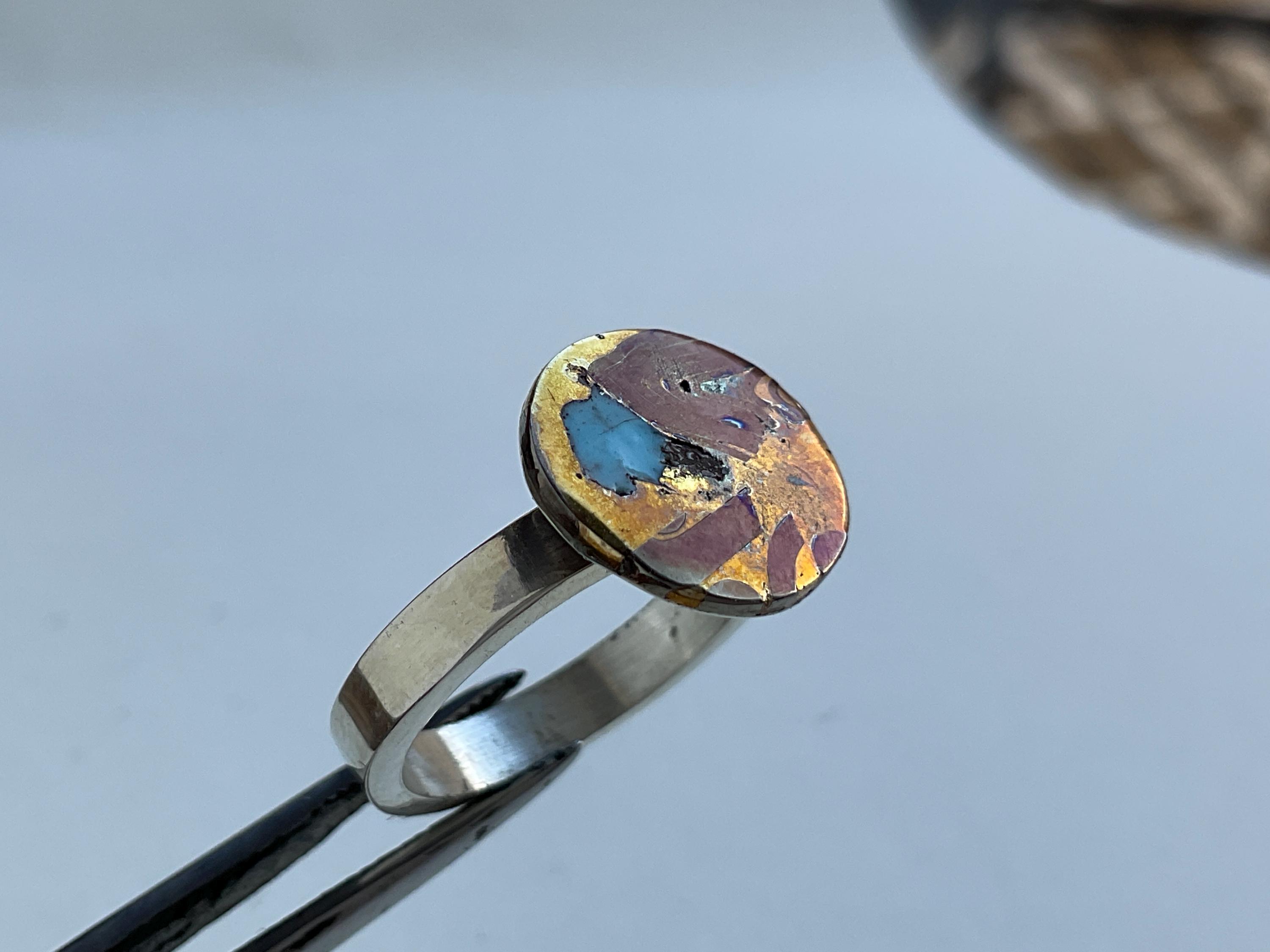 This work is made from recycled metal plus sterling silver for the parts which contact the wearer’s skin. I add a layer of clear wax to the surface of the recycled parts to slow the rate of tarnishing. You should wipe off fingerprints as soon as you see them with a soft cloth. Avoid acids, abrasives or salt, they will remove the coloured layer and react with the metal. The work will age gracefully.