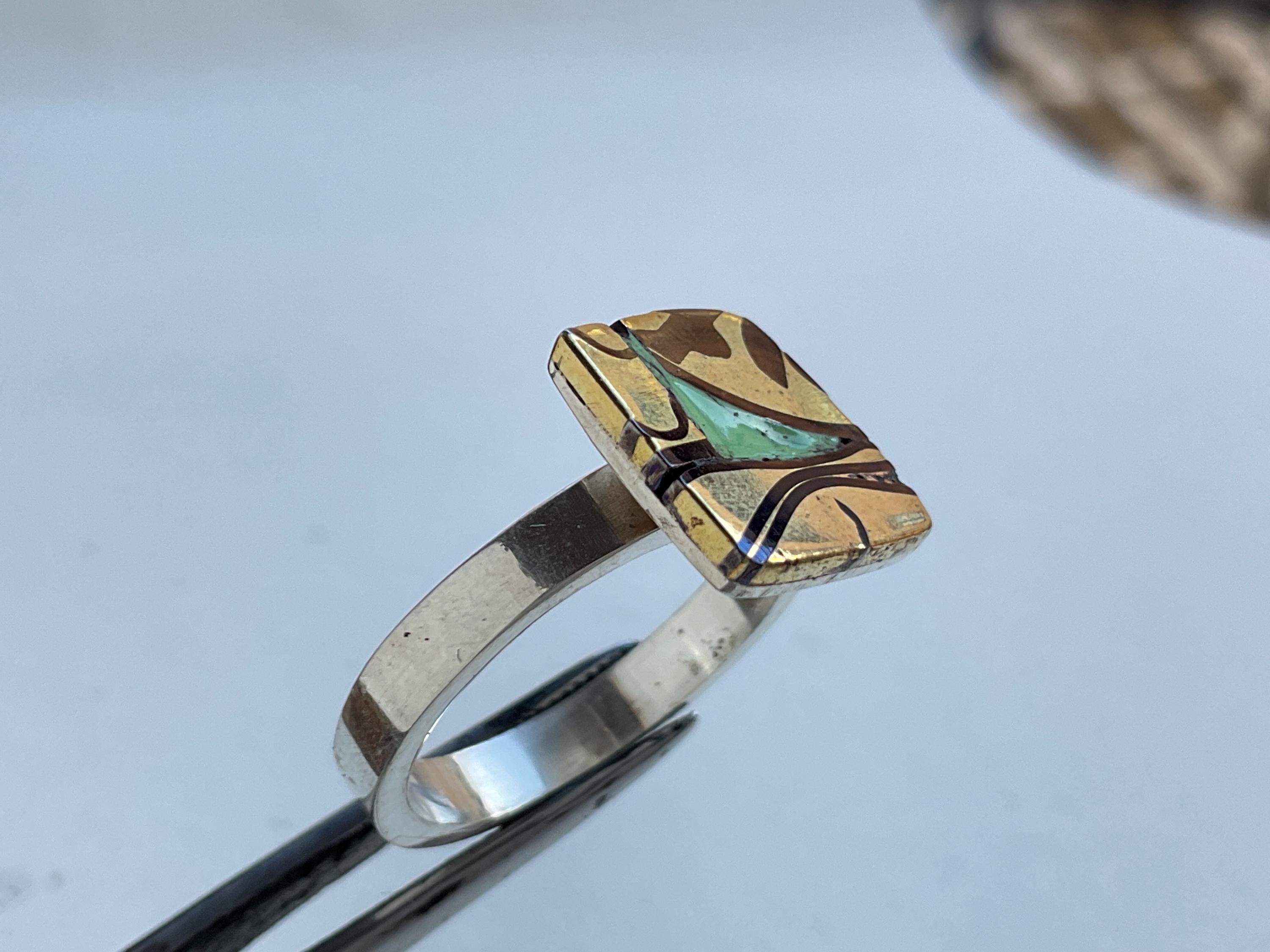 This work is made from recycled metal plus sterling silver for the parts which contact the wearer’s skin. I add a layer of clear wax to the surface of the recycled parts to slow the rate of tarnishing. You should wipe off fingerprints as soon as you see them with a soft cloth. Avoid acids, abrasives or salt, they will remove the coloured layer and react with the metal. The work will age gracefully.