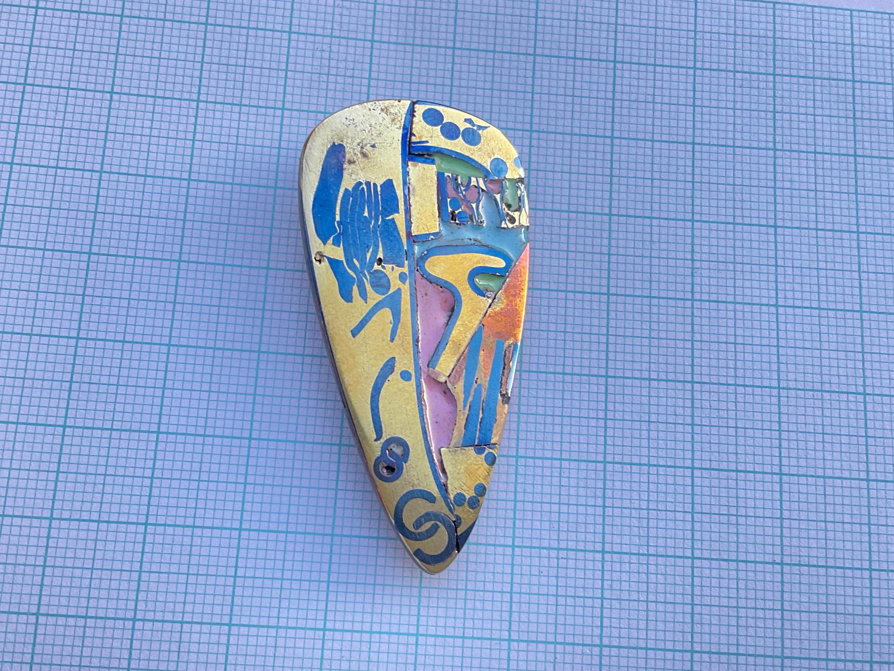 Mixed metal, different coloured enamels, textured back surface. 10mm grid for scale.