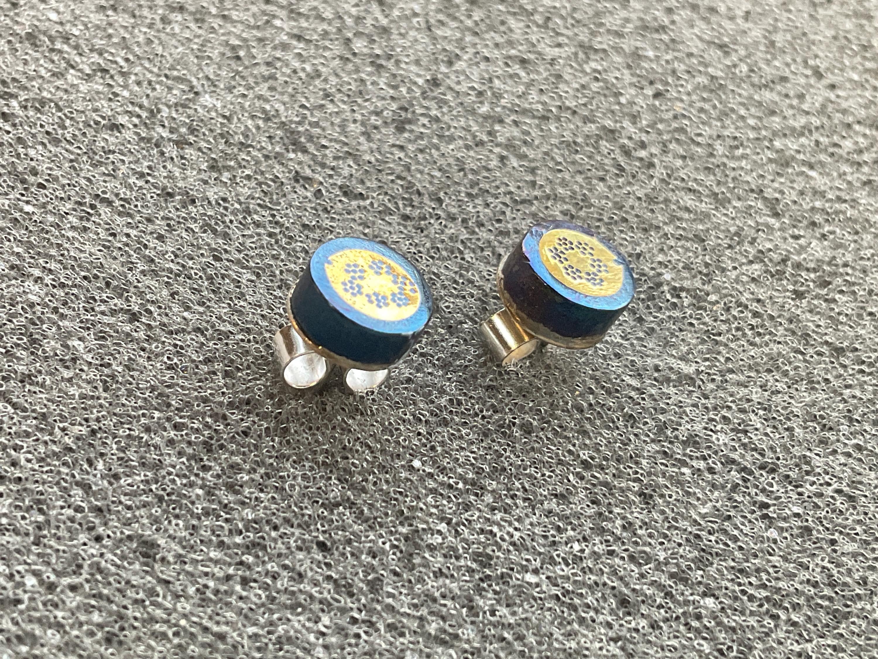Mixed metal earring with silver post. 6mm cylinder of steel and bronze.