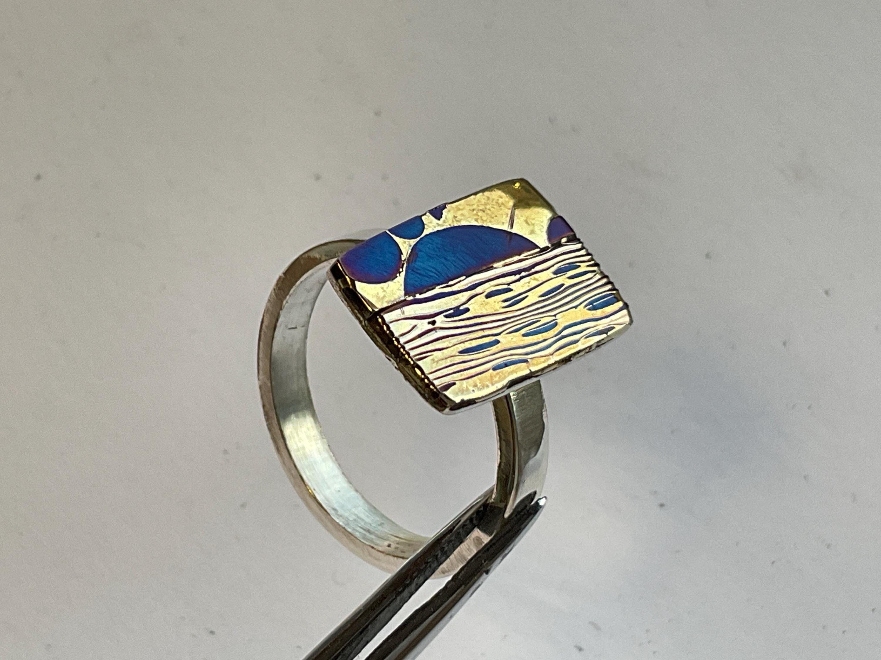 This work is made from recycled metal plus sterling silver for the parts which contact the wearer’s skin. I add a layer of clear wax to the surface of the recycled parts to slow the rate of tarnishing. You should wipe off fingerprints as soon as you see them with a soft cloth. Avoid acids, abrasives or salt, they will remove the coloured layer and react with the metal. The work will age gracefully.