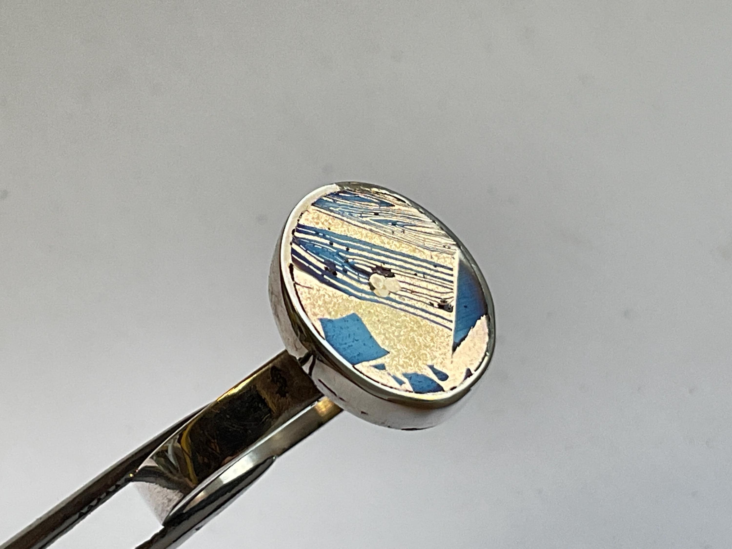 This work is made from recycled metal plus sterling silver for the parts which contact the wearer’s skin. I add a layer of clear wax to the surface of the recycled parts to slow the rate of tarnishing. You should wipe off fingerprints as soon as you see them with a soft cloth. Avoid acids, abrasives or salt, they will remove the coloured layer and react with the metal. The work will age gracefully.