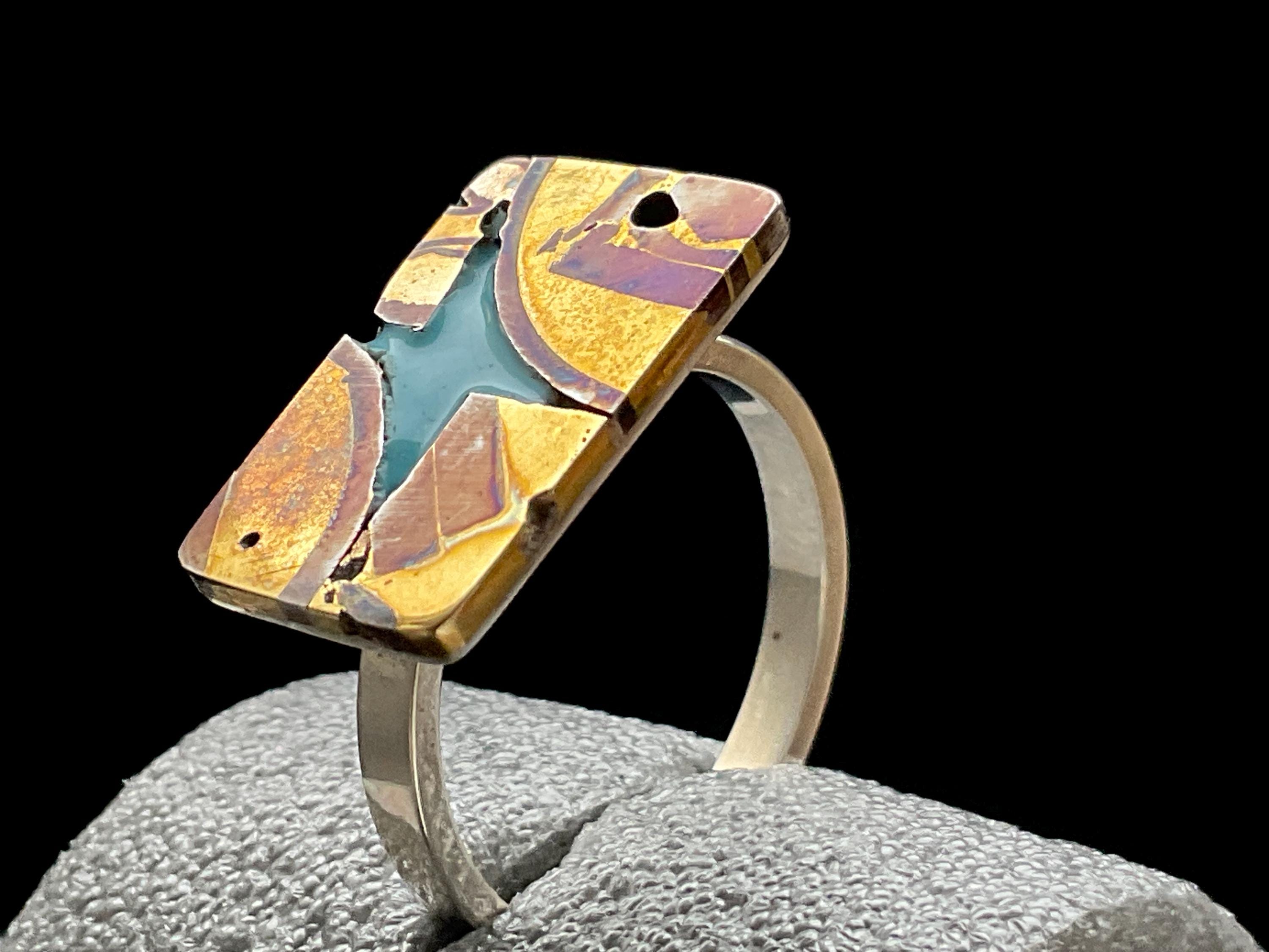 This work is made from recycled metal plus sterling silver for the parts which contact the wearer’s skin. I add a layer of clear wax to the surface of the recycled parts to slow the rate of tarnishing. You should wipe off fingerprints as soon as you see them with a soft cloth. Avoid acids, abrasives or salt, they will remove the coloured layer and react with the metal. The work will age gracefully.