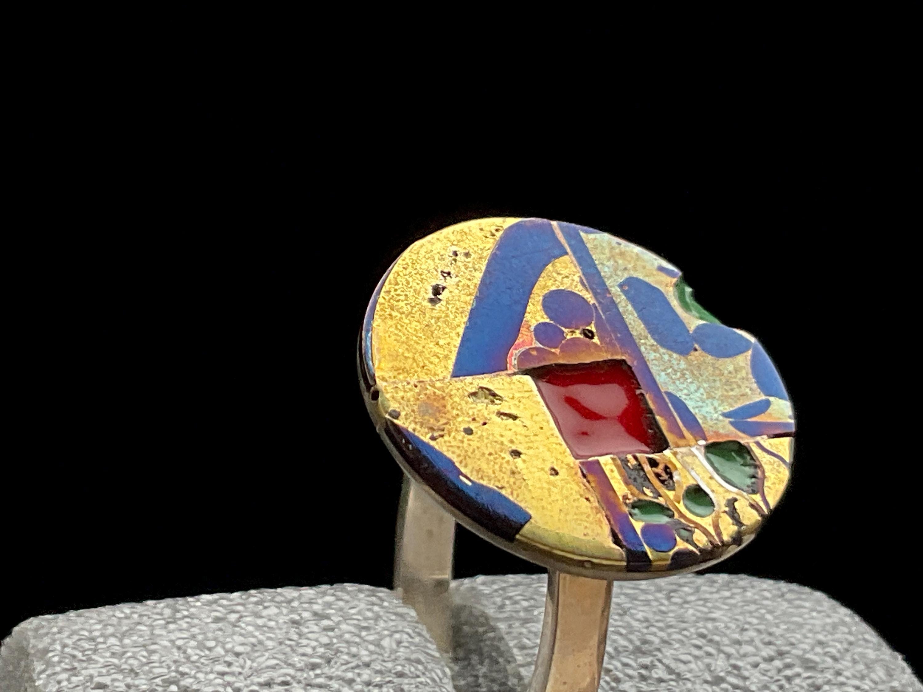 This work is made from recycled metal plus sterling silver for the parts which contact the wearer’s skin. I add a layer of clear wax to the surface of the recycled parts to slow the rate of tarnishing. You should wipe off fingerprints as soon as you see them with a soft cloth. Avoid acids, abrasives or salt, they will remove the coloured layer and react with the metal. The work will age gracefully.