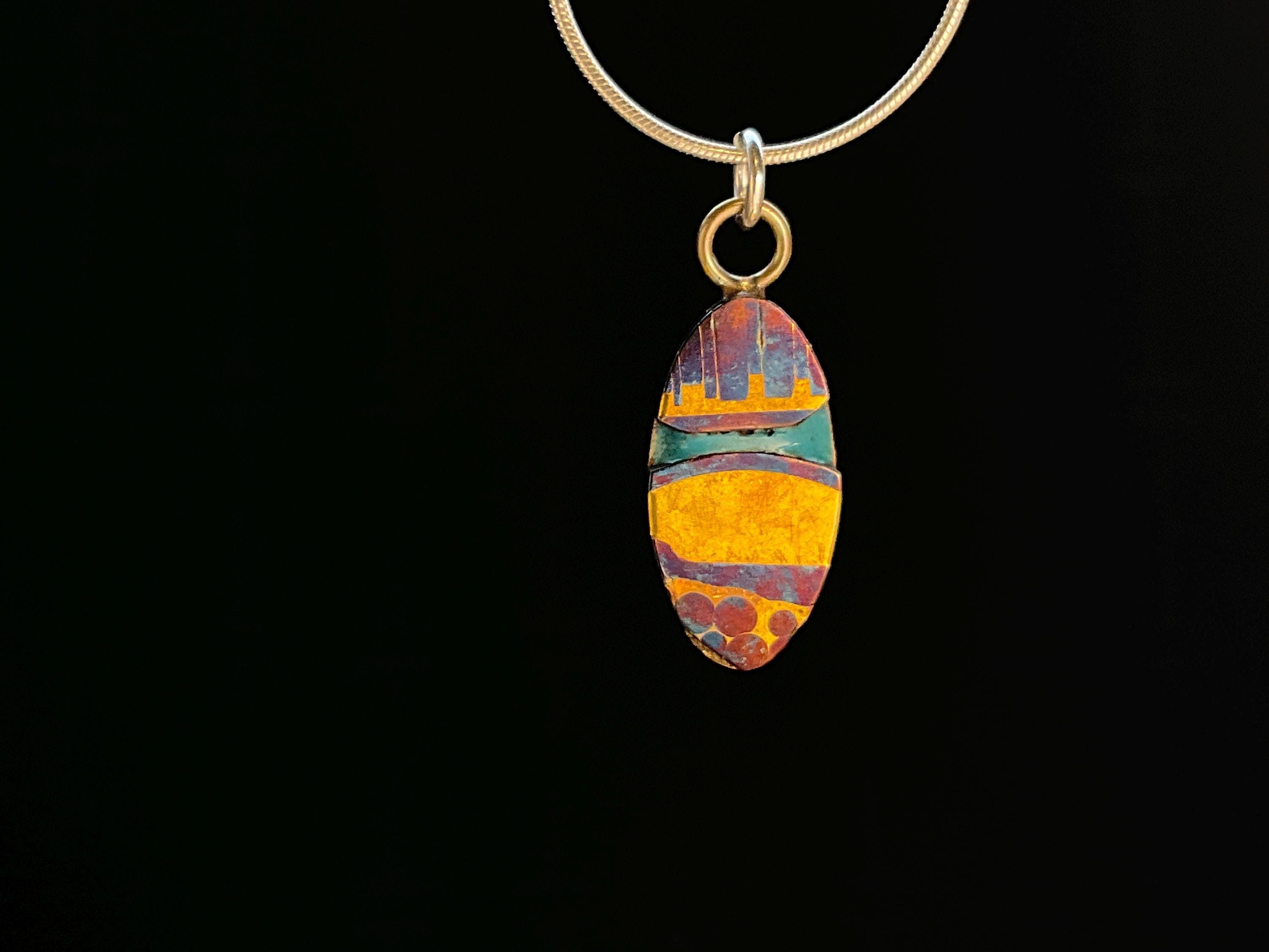 Mixed metal and enamel, silver back surface. 24mm elipse. 20” / 50mm snake chain
