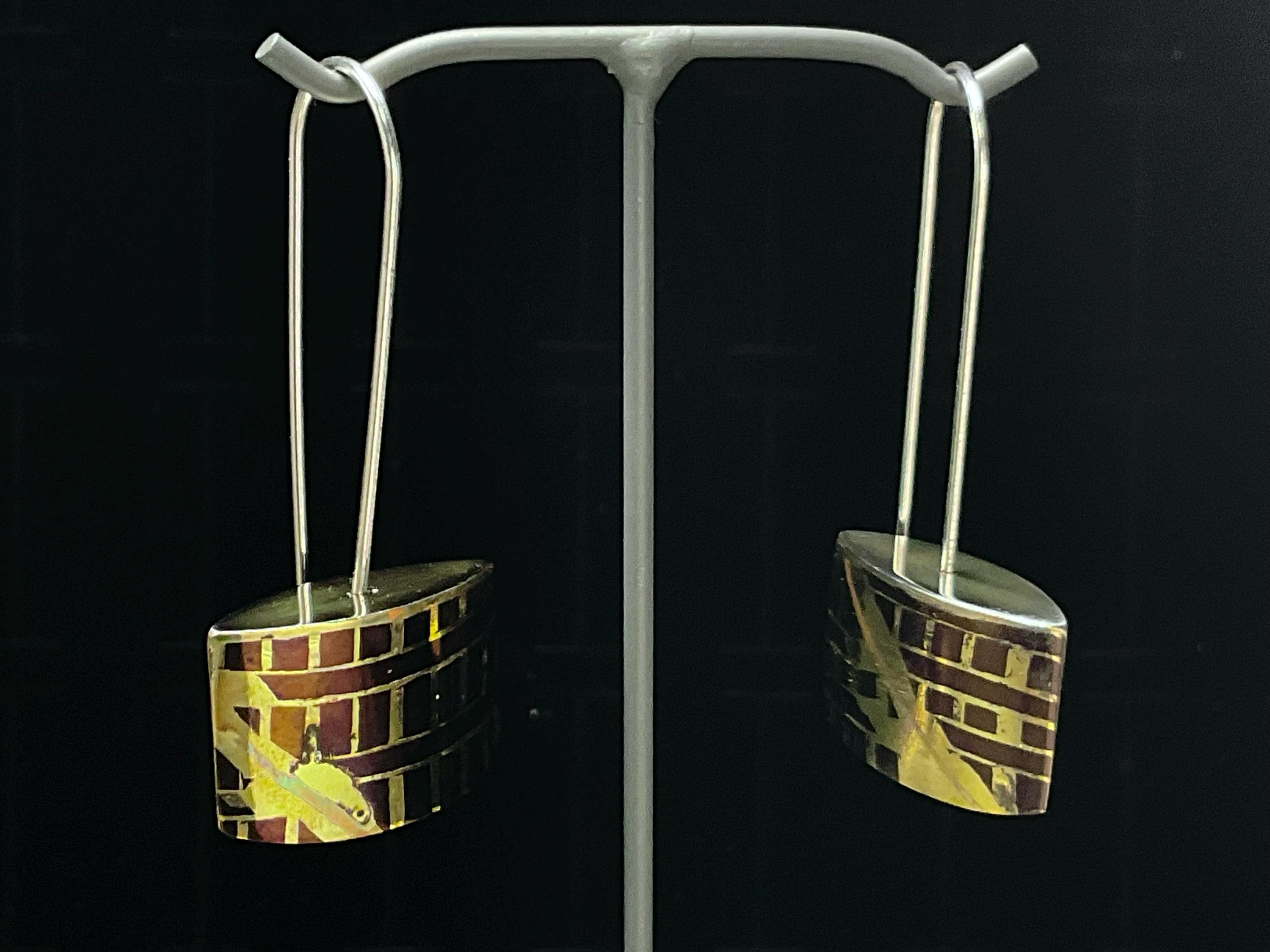 This work is made from recycled metal plus sterling silver for the parts which contact the wearer’s skin. I add a layer of clear wax to the surface of the recycled parts to slow the rate of tarnishing. You should wipe off fingerprints as soon as you see them with a soft cloth. Avoid acids, abrasives or salt, they will remove the coloured layer and react with the metal. The work will age gracefully.