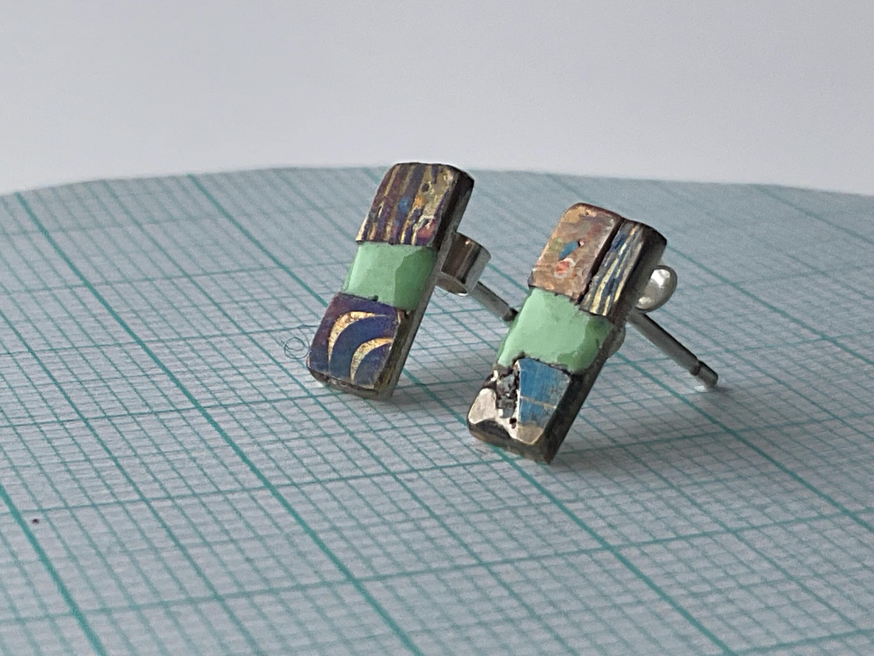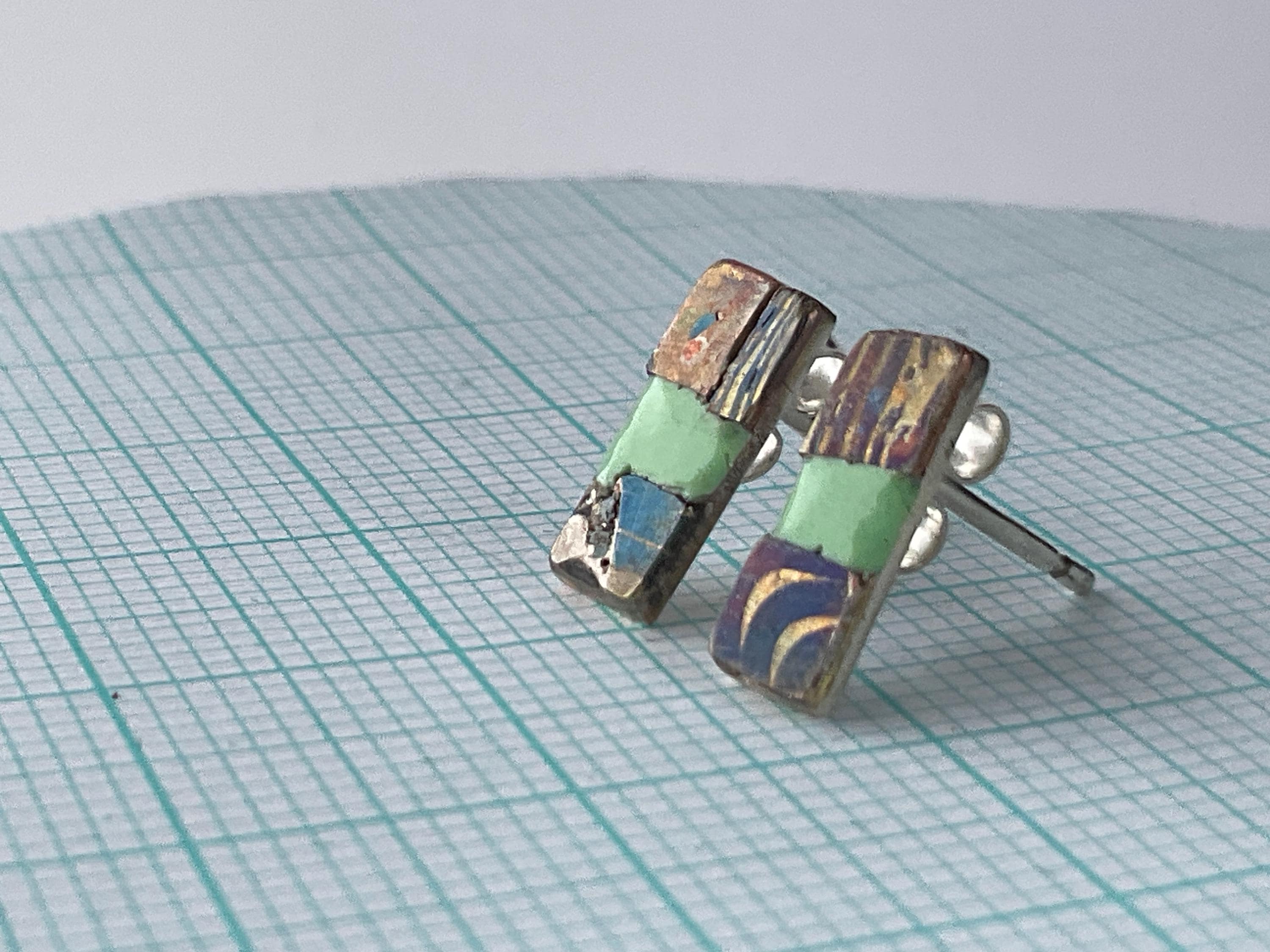 Enamel and mixed metal earring with silver earwire and back surface. Photographed on 10mm grid